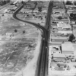 "This aerial photo of Tulare, CA, taken in the mid-1930s, looks north along ""Old Highway 99"" toward the community's business district. (Photo courtesy of Nancy Baird)"