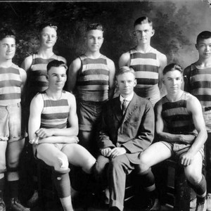 "This was the Dinuba (CA) High School basketball team in 1919. Members were, left to right front row: Earl Gregory, Coach ""Mr. Marshburn,"" Willard Gregory; back row: ""Little Ike"" Lavan Frankian, Bill Prestige, Jack Akers, Roy Rice, and Foon Kai Kee. (Photo courtesy of Alta District Historical Society)"