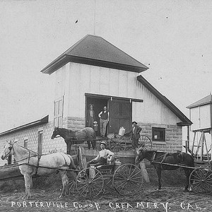 This 1910 photograph shows the Porterville Cooperative Creamery, which was south of the later location of Olive Street School in Porterville. Those shown in the photo include Harry Scruggs and J. D. Beckwith. (Photo courtesy of Porterville Library)
