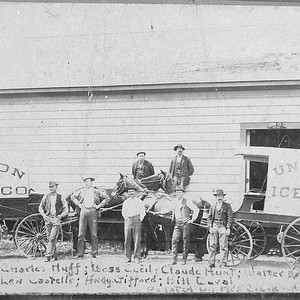 Men pose in front of the Union Ice Co. in Visalia, CA, ca 1900. From left to right are Charles Huff, Ross Cecil, Claude Hunt, Walter Reddy, Len Castrello, Andy Gifford, and Bill Loval.
