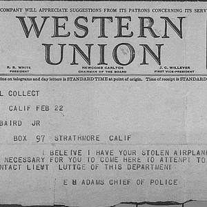 "Vernon ""June Bug"" Baird's airplane, parked about 100 yards from the family home in Strathmore, CA, was stripped of its motor and other parts in February, 1938 by a thief in the middle of the night. This telegram told Baird of the recovery of the parts in Southern California. The thief, captured in Burbank, CA, was identified as Lowell Lee. (Photo courtesy of Nancy Baird)"