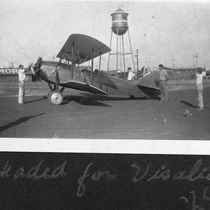 "Vernon ""June Bug"" Baird and his friends get ready to board a plane with the Strathmore, CA, water tower is in the background. The year was 1928. (Photo courtesy of Nancy Baird)"