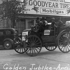 "This photo shows a ""high wheeler"" pre-1902 automobile, entered by Linder's Furniture Store, as an entrant in the 1938 Golden Jubilee of the community of Tulare, CA."