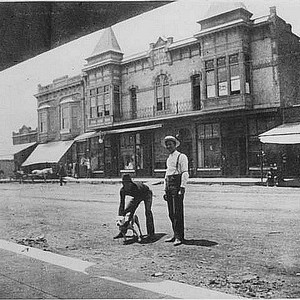 The west side of Main Street between Mill and Oak streets is seen in this photo taken in Porterville, CA, ca 1890. The large building is the Pioneer Store and the small building to the right is Scotty's Chop House. (Photo courtesy of Porterville Library)