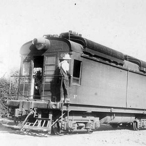 Visalia Electric Railroad's Engine #401 is pictured in Lemon Cove, CA, in 1943. Shown here, Donald McFadzeon was the brakeman. (Photo courtesy of Frances Kirkman)