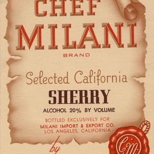 Sepia and red label for Chef Milani brand Sherry. Label depicts an old opened scroll with a wax seal containing the letters C.M. Wine is bottled for Milani Import & Export Co. by J. Filippi Vintage Co. in Mira Loma, California. If you know any details from this image please contact the Rancho Cucamonga Public Library at (909) 477-2720 or reference@cityofrc.us