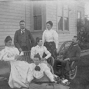 A group of Porterville, CA, teachers are shown at the Abbot house in Porterville, CA. They taught at the Morton Street school. L to R: Grace Redfield, Louis Weber, Seated: D.W. Lindsay, Martha McFarland (not a teacher) and Marguerite Hjey. Sitting in front is Miss Frankie Henry. (Photo courtesy of Porterville Library)