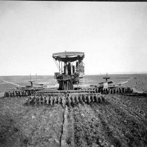 This mechanical cultivator covered a strip of land about 30 feet wide, with the man at each side guiding an individual cultivator being pulled at the mechanical rig. (Photo courtesy of Steve Worthley)