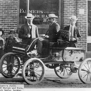 John Albert Goble of the Farmers and Merchants Bank studies the modern conveniences of the auto driven by a Mr. Moore in Tulare, CA, in 1920. (Photo courtesy of Ellen Gorelick, Director, Tulare Historical Museum)