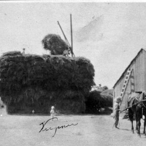 Hay is shown being stacked on the Worthley ranch at the community of Bowles, near Easton, CA, in 1912. (Photo courtesy of Steve Worthley)