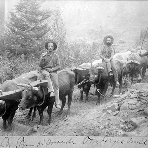 "The caption written on this photo states ""Ox Train in Woods Near Hayes Mill."" This photo is believed to have been taken in the late 1800s in the High Sierras of Tulare County, CA."