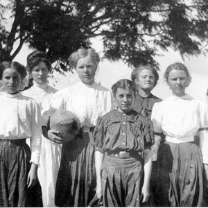 This was the first girls' basketball team at Rocky Ford School in Porterville, CA, in 1909. Left to right are Villa Bradley, teacher Marie Simonich, Grace Bradley, Effie Howe, Eulalie Flory, and Mildred Carpenter. (Photo courtesy of Mary Haven)