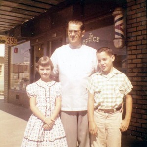 Show with Oral Rasner in front of his barber shop in Exeter, CA, are Jane and Christopher Ricketts, children of Jane Harper Ricketts. (Photo courtesy of Jane H. Ricketts)