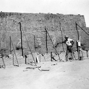 H. Burney Tharpe stands in front of a brick kiln ready to be fired, north of Visalia, CA. It took six to seven days of firing to burn bricks into their finished form. Six arches were used in which very hot fires were burned. Thorpe owned and operated the brick plant and also was a general contractor. (Photo courtesy of Maureen Anderson)