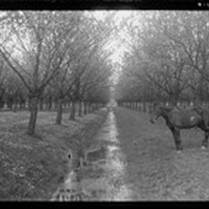 Image / Mei 1910. [Horse at canal in orchard.] [negative]