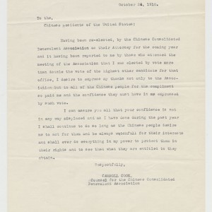 Text / Letter to Chinese Residents of the U.S. from Cook