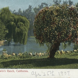 Postcard of Lake at Baldwin's Ranch, California. Lake and trees are depicted. Date Apr 26th 1907 is handwritten. Printed by M. Rieder, Publ., Los Angeles, Cal. and Leipzig.