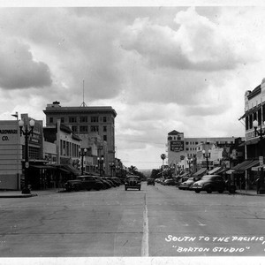Postcard image from Barton Studio showing Greenleaf Ave. looking south from the corner of Bailey. Hotel Hoover can be seen at the far right of the photograph.