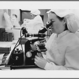 Electronic industries; Manufacturing; Microscopes; People; Photographs; Quality assurance; Santa Clara (Calif.); Santa Clara County (Calif.)--History; Semiconductor wafers; Technicians; Technology; Women