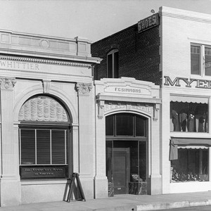 Photograph shows the Community Bank of Whittier. Also shown is the F.G.Simmons building and the Myers Brothers building.