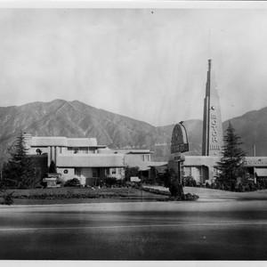 View north across Huntington Drive to Santa Anita Motor Inn with San Gabriel Mountains looming up clearly in background. The Chantry Flats Road is seen plainly. Built in 1938, the motel continued to operate at 101 W. Huntington Drive until it was torn down in 1974.