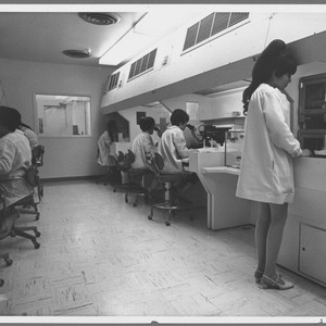Electronic industries; Manufacturing; Microscopes; Miniskirts; People; Photographs; Quality assurance; Santa Clara (Calif.); Santa Clara County (Calif.)--History; Semiconductor wafers; Technicians; Technology; Women
