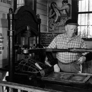 William Parker Lyon demonstrating printing tools and machine. Pony Express Museum. Sign to the left of the machine reads WANTED FOR MURDER WILLIAM BONNEY ALIAS BILLY THE KID $2500.00