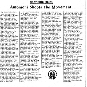 Karen Dellenbach, "Zabriskie Point: Antonioni Shoots the Movement," The Plain Rapper, Vol 1 (2), February 10, 1969,p 7. Michelangelo Antonioni shot the first ten minutes of Zabriskie Point at the Free Church on 2200 Parker Street in January 1969. This was arranged by Anthony Nugent. Nugent remembers that this discussion between black and white radicals was reenacted in real life with a similar debate during the Third World Liberation Front demonstrations in February. Along with some well known radicals (Kathleen Cleaver and Bill Garaway), there are a few Free Church members present: Nugent , Glen Clarke and the man who looks like Che Guevara.The church received $1750 from MGM.