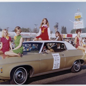 1969 Arcadia Rose Court: Queen Cindy Clark (on roof of car), Princesses Jacquie Wicken, Debbie Lewis, Cindy Harms, and Janis Thompson sit atop gold-colored Chevrolet Impala. One wears a majorette (baton twirler) outfit. Quick Clean Center in the background, located at 1035 South Baldwin Avenue in Arcadia, California, operated by Edward Kieser and Henry Danowsky.