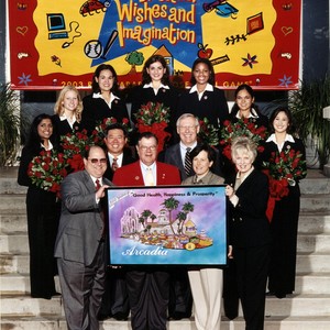 Gary Thomas, Arcadia resident and President of the 2003 Tournament of Roses, with Arcadia City Council members Gail Marshall (2002-2003 Mayor), Gary Kovacic, Mickey Segal and John Wuo holding artist's rendering of Arcadia's 2003 Rose Parade float entry. The 2003 Arcadia Rose Court Princesses including Arcadia resident Anjali Agrawal are standing behind holding bouquets of red roses. A banner with the Rose Parade theme "Children's Dreams, Wishes and Imagination" is in the background.