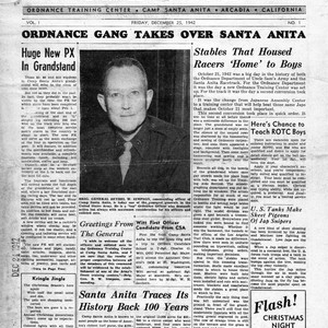 Man O' War newspaper of the Ordnance Training Center at Camp Santa Anita, Arcadia, California. Issue date December 25, 1942.