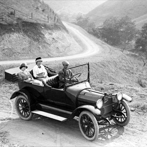 Photograph shows 3 people riding in a automobile on Turnbull Canyon Road.