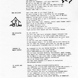 Berkeley Free Church Newsletter, May 1972, indicating future plans and announcing "We are still alive and well in Berkeley." Jock Brown leaves. This is the final newsletter.