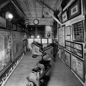 Pony Express Museum exhibit room featuring Gold Dry Washer in the center. On right side wall hang photographs of "The World's Three Most Famous Men," Buffalo Bill, Abraham Lincoln, and William Parker Lyon.