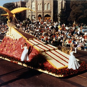 "America the Beautiful," Arcadia's float entry in the 1962 Pasadena Tournament of Roses Parade. Perched atop red, white and blue shield is a majestic eagle with wings spread.