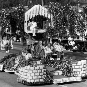 Your Own Back Yard, Arcadia's float entry in the 1992 Pasadena Tournament of Roses Parade, features a garden area centerpieced by a large tree and tree house. Riding on the float is the Arcadia Rose Court wearing athletic jogging suits.