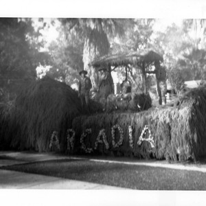 Arcadia's 1929 float entry in the Pasadena Tournament of Roses Parade, "The Old Oaken Bucket." This float was entered by the Boy Scouts. Wishing well is blurry under a canopy.