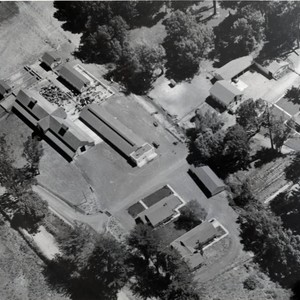 Aerial view of the Bear Valley Ranch, Marin County, California, circa 1945. From 1943 through 1949, the property was operated by Eugene C. Compton, as a dairy ranch. Compton also staged rodeos in an arena he built for that purpose. The "W" or Bear Valley Ranch site later became the park headquarters for the Point Reyes National Seashore, which was established in 1963.