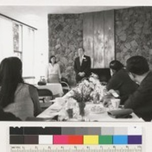 Image / Unidentified people at a reception, watching a Kurt Lauridsen say something