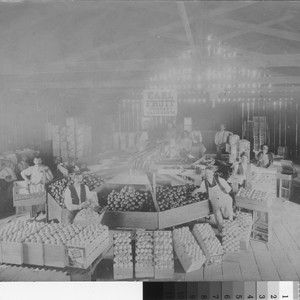 Depicts the inside of the Earl Fruit Company citrus packing house. Examples of citrus fruit packing crates can be seen in this photograph.