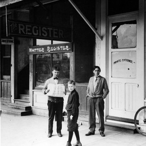The Whittier Register newspaper which was published from 1892 to 1909. 2 men and a young boy stand outside of the building. One many is holding up a copy of the Whittier Register.