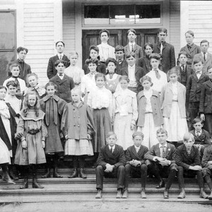 Image depicts students from the Bailey School class of 1907. Students and teacher are listed as Mrs. Landrum Smith, Frank Swain, Charles Taber, Greta Hazzard, Lyda McCoid Bard, Newby, Jesse French, Jessie Way, Elizabeth Thomas, Cora Marshburn, Alma Johnson.