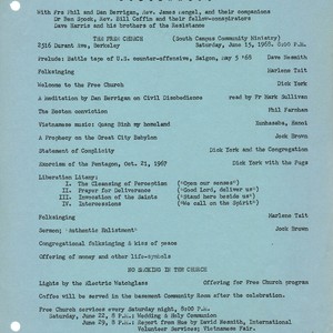 Program lists the elements to this celebration: a battle tape, folksinging, Vietnamese music, mention of York's participation in the exorcism of the Pentagon with the Fugs, and Jock Brown's sermon on "Authentic Enlistment." York announced during the service that Presbyterian minister Anthony Nugent would be joining the church along with Glee Bishop and Brown.