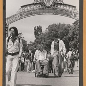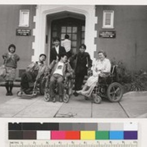 Unidentified people posing and Susan O'Hara in front of the U.C. Berkeley Disabled Students Program building, three are in wheelchairs, one is on crutches and two are standing
