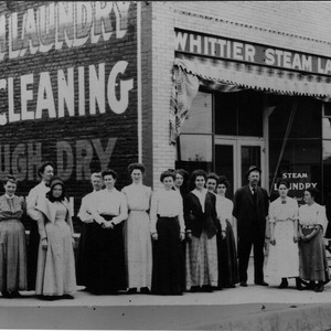 Whittier Steam Laundry on South Greenleaf just north of Wardman in 1906.A group of women and 2 men (one is next to a bicycle) are standing out front on the sidewalk.
