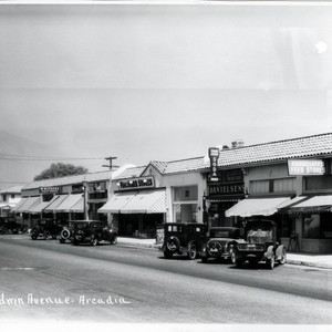 A section of Baldwin Avenue business district in the 1000 S. Baldwin block in 1930. Eleven automobiles are diagonally parked in front of the various shops. The prominent sign on the right reads Associated Feed Stores.
