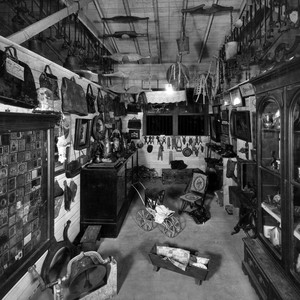 Portion of Pony Express Museum given to miscellaneous collections. On left wall are what appear to be old photographs. Above those are bags labeled OLD CARPET BAGS. Many branding irons hang from the ceiling. There is a large bell in foreground. There is an old doll carriage and a wooden rocker on the floor.