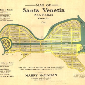 This map, issued in August 1914 by Mabry McMahan, illustrates his proposed development of Santa Venetia, in San Rafael, California. McMahan was responsible for filling in Santa Venetia's marshland and creating a series of canals, on which he hoped to create a luxury subdivision modeled after the Italian city of Venice. McMahan's plans failed to be realized due to the economic hardships of WWI. After WWII, San Venetia was developed into one of San Rafael's residential neighborhoods, although not in the style envisioned by McMahan.
