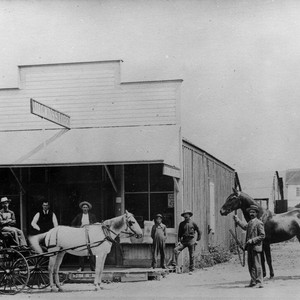 Gwin's first grocery store on Philadelphia in 1892. Photograph is taken from alley between Comstock and Milton on Phildelphia shooting north. Background right is the first Bailey Street School which faced Bailey.