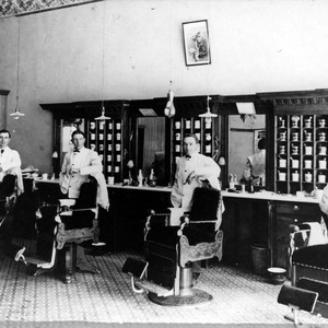 Barbers posing beside their chairs in a barbershop. Location is unknown. Photograph is captions by Orville Espolt and reads "Private mugs for Whittier's fastidious mugs in 1906."